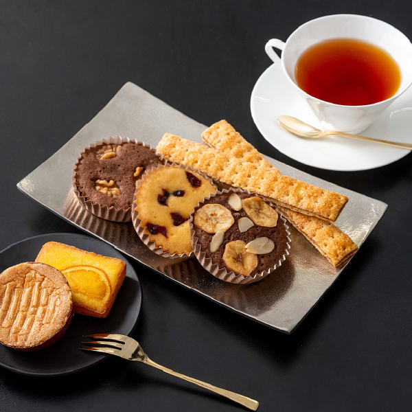 しっとり生地にフルーツやナッツを飾ったプチケーキやオレンジケーキ、さくっとした食感の中にキャラメルの風味が香る少し長いサイズのロングパイ、アーモンドが香ばしく香るフランス伝統の厚焼きクッキーと、ホテルの豊かなティータイムを演出するスイーツを詰め合わせました。 -