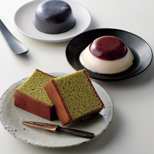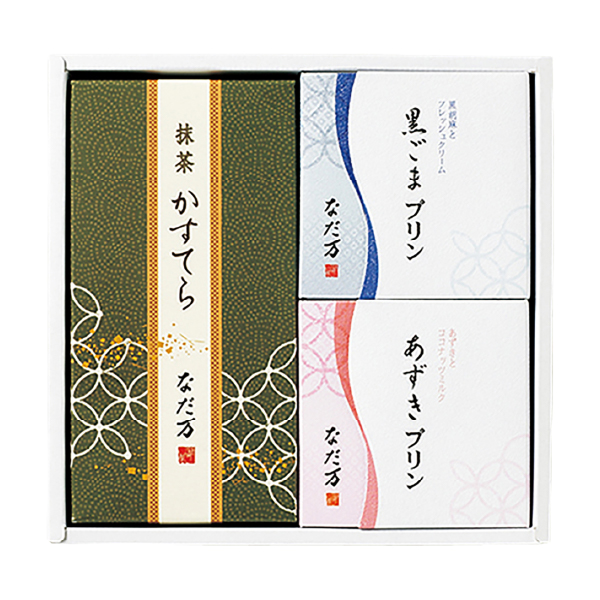 1830年(天保元年)に大阪で創業された「なだ万」。国産小麦を使い、もっちりした食感と独特のしっとりした口当たりのかすてらと、ココナッツミルクなどの洋の素材を取り入れ、小豆・黒ごまの和素材を組み合わせた風味豊かなプリン。どちらも老舗にふさわしい、伝統を感じさせる味わいです。 -