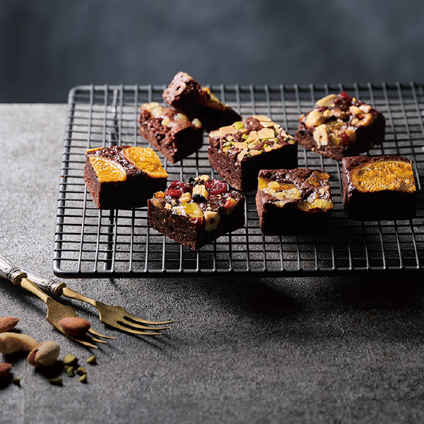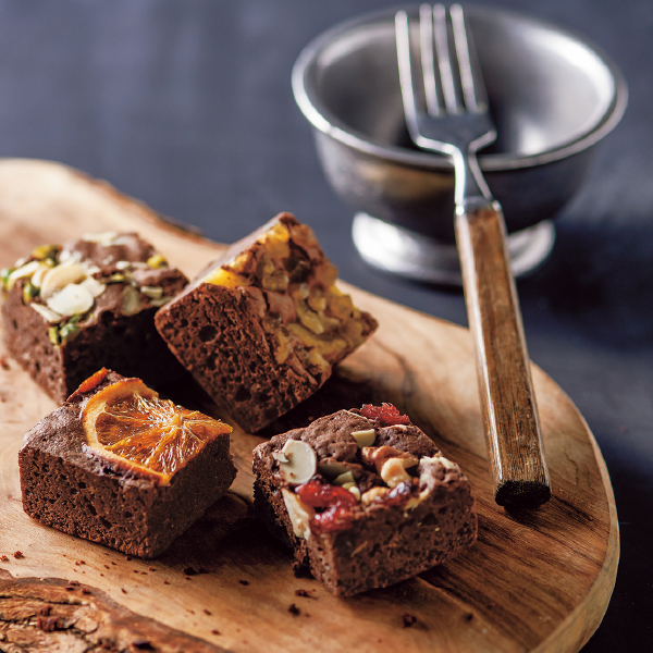 濃厚なチョコレートの生地に、香ばしいナッツや甘酸っぱいフルーツをトッピング。ピスタチオとアーモンド、ごろっとしたパイナップルやネーブル、たっぷりのドライフルーツとナッツ…。おいしさをぎゅっと詰め込んだキューブが、お口に小さなしあわせをお届けします。 -