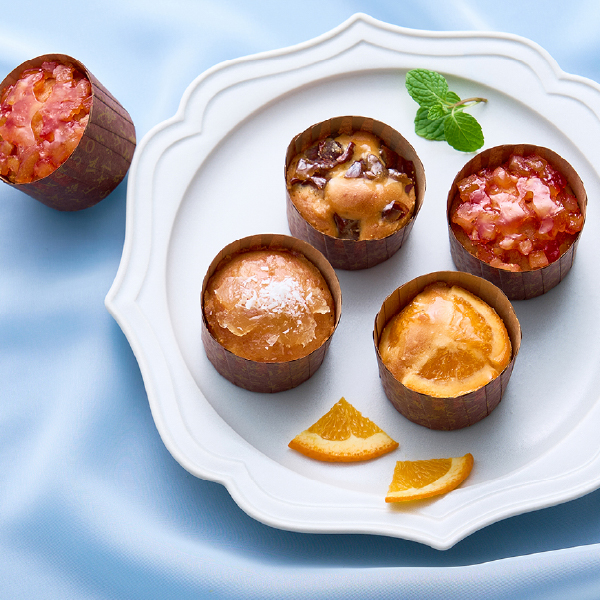 艶っと光るシロップ漬けの果実や、セミドライの果実がジュエリーのようなカップケーキです。空気をたっぷり含ませて焼きあげた、果実入りのなめらかな生地に煌めく果実たちをトッピングして、果実を味わうカップケーキに仕上げました。 -