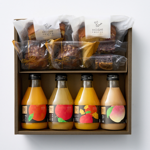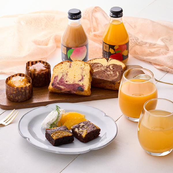 日本のフルーツの純粋な美味しさを味わうジュースと、果実の彩りを閉じ込めた華やかな焼き菓子をセットにして、贅沢なおうちカフェ時間をお届けします。 -