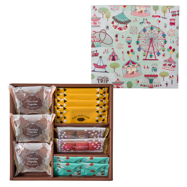 ふんわり2層のチョコカップケーキ、濃厚なチョコレートの風味が特徴の焼きショコラ、焦がしバター香るキャラメリゼされたワッフルクッキー、いろどりプチサイズのフィナンシェ。楽しさ詰まった、魅惑のお菓子たちで、笑顔の時間をプレゼントします。