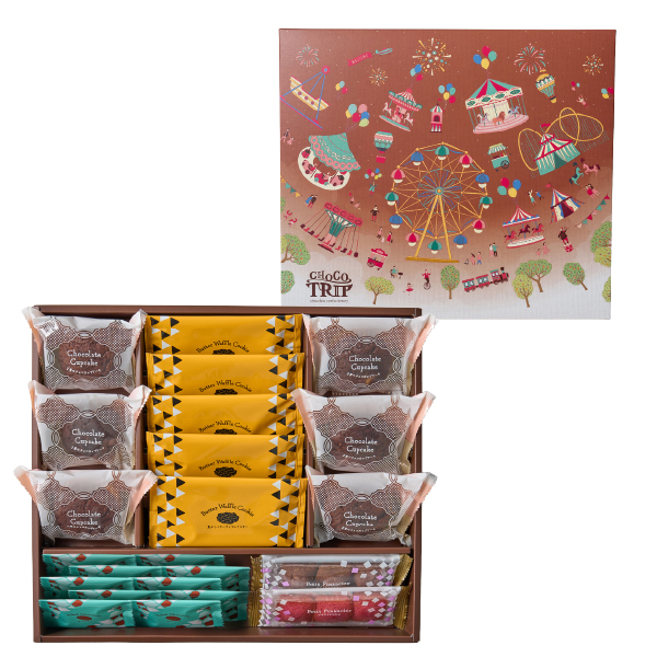 ふんわり2層のチョコカップケーキ、濃厚なチョコレートの風味が特徴の焼きショコラ、焦がしバター香るキャラメリゼされたワッフルクッキー、いろどりプチサイズのフィナンシェ。楽しさ詰まった、魅惑のお菓子たちで、笑顔の時間をプレゼントします。