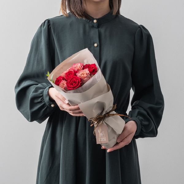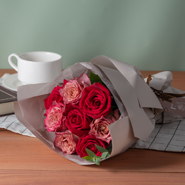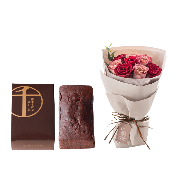 バラブーケとブランドスイーツのコンビギフトです。艶やかなベルベットのような深紅のバラ・サムライと、シックな花色の変化が美しい「テナチュール」を組み合わせたフリルブーケ。華やかさとアンティークな雰囲気を合わせ持つ豊かな表情が魅力です。まるでドレスをまとったようなふわりと重ねたフリルがかわいいラッピングでお届けします。また、ブーケと一緒に、いよかんを生地に練り込んだ銀座千疋屋チョコパウンドケーキをセットにしました。柑橘類独特の酸味と芳醇な香りがチョコレートの甘さを引き立てます。大切な方の記念日に、想いを伝えたい時におすすめです。 -