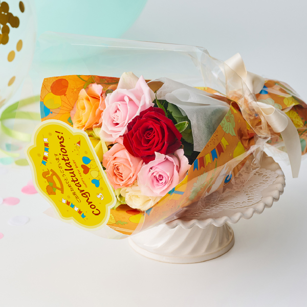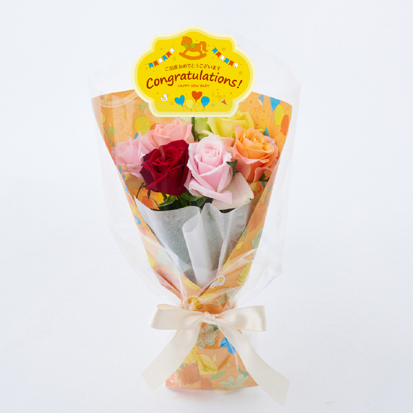 幸せに満ちた空間を明るくやさしく彩る、フレッシュなバラの贈りもの。ママやご家族への想いも込めた出産祝に。 -