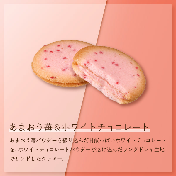 「あまおう苺&ホワイトチョコレート」を4枚詰めました。ラングドシャのサクッとした口あたりと、風味豊かなチョコレートのハーモニーをお楽しみください。※福岡県産あまおう苺58%使用(苺中) -