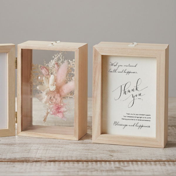 内容 本体(幅10.5×奥行8.5×高さ14.5cm)×1 材質 ドライフラワー、プリザーブドフラワー、桐、アクリル、PET、紙 重量 140g お届けについて